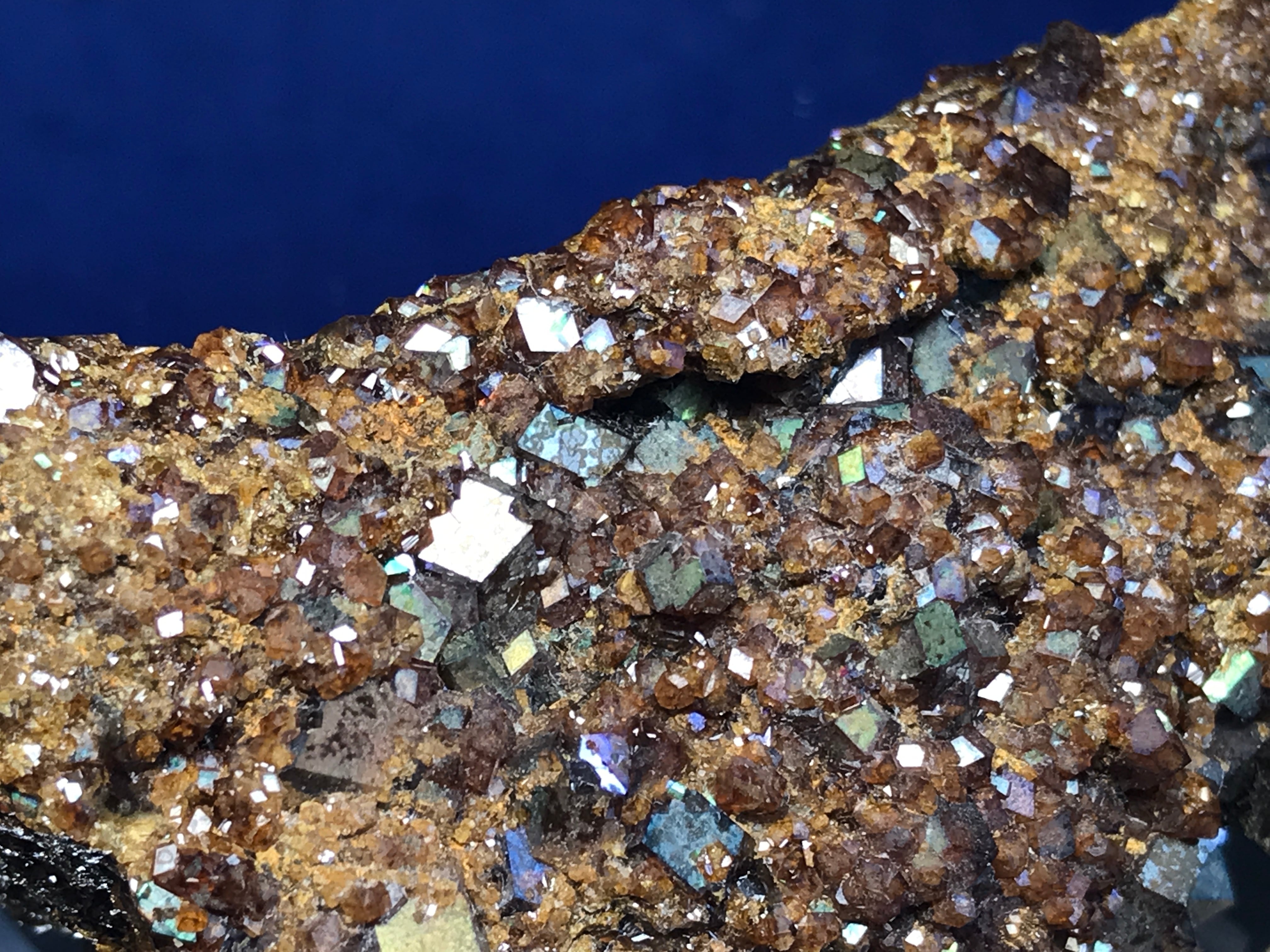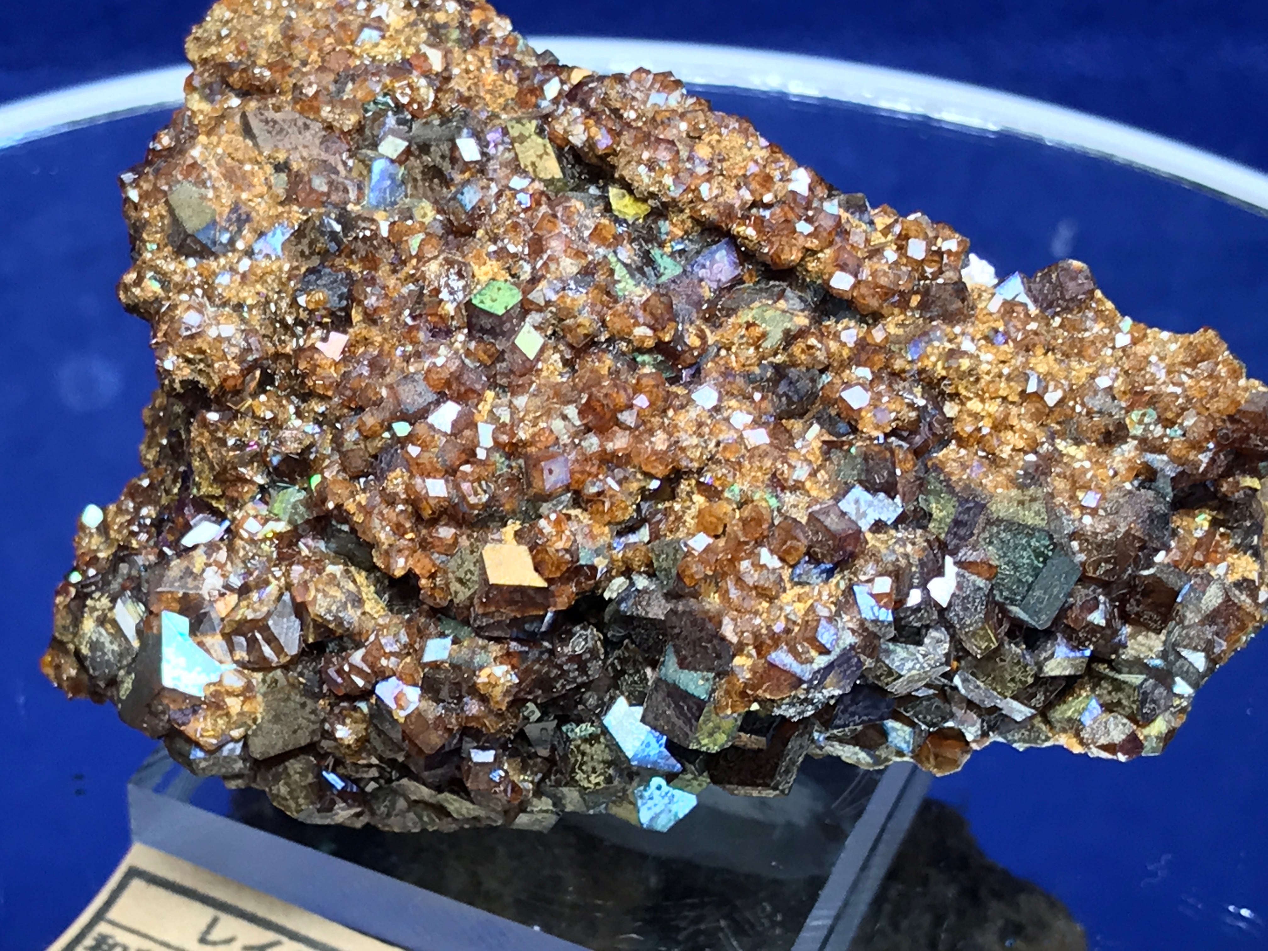 粒の大きなレインボーガーネット結晶の上に、小粒のレインボーガーネットが再結晶した、